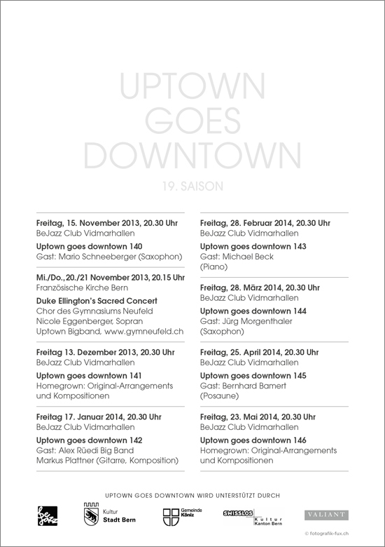 Hochzeit von Tina Turner 27. Juli 2013 (Zürichsee-Zeitung)Veröffentlicht08.10.2013 - Am 15. November startet die Uptown Big Band zur 19. Saison der Konzertreihe "Uptown goes downtown" im BeJazz Club in den Vidmarhallen. Neben spannenden Gastsolisten werden wir unser Repertoire an Eigenkompositionen hegen und pflegen und hoffentlich bis im Frühling 2014 zur Aufnahmereife bringen. Zudem werden wir für zwei Konzerte mit dem Gymnasium Neufeld Bern zusammenarbeiten.